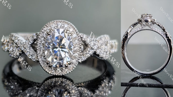 The center stone of picture is 1ct(5*7mm) oval H&A moissanite DovEggs moissanite. Ring setting is 14k white gold.