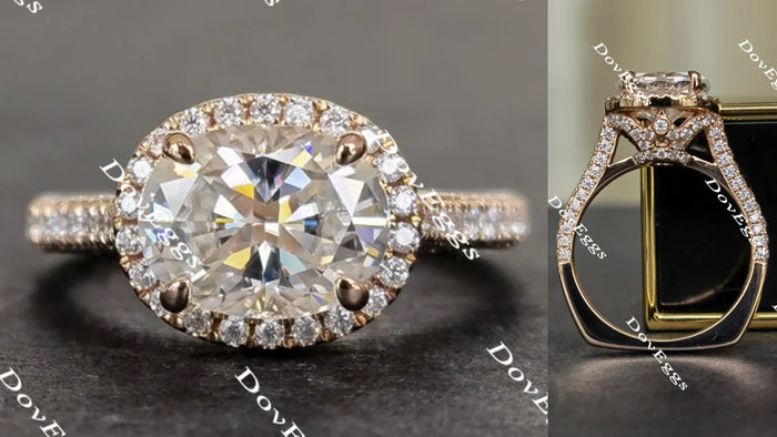 The center stone of picture is 2ct(7*9mm) oval astro DovEggs moissanite. Ring setting is 14k rose gold.