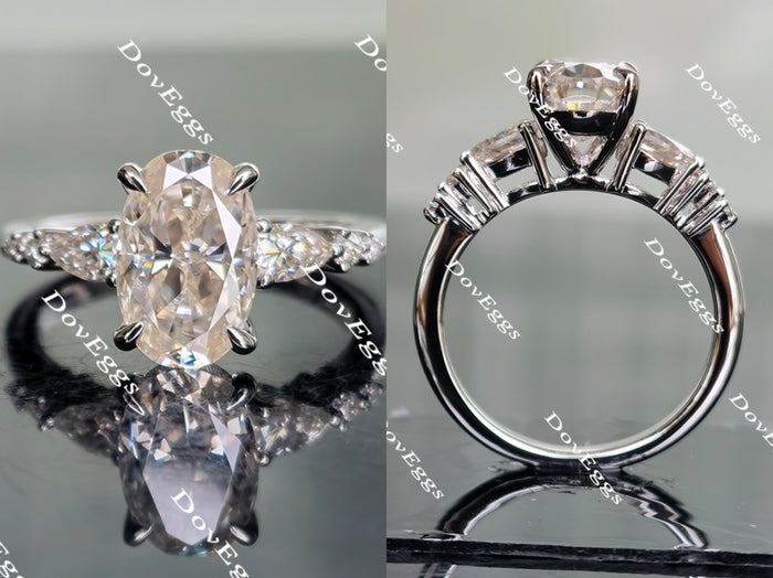 Center stone of picture is 3ct(7*11mm) GHI color elongated oval crushed ice cut DovEggs moissanite.Ring setting is 10k white gold.