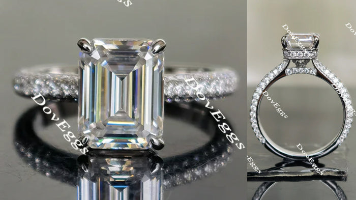 The center stone of picture is 3ct(7*9mm) DEF color emerald DovEggs moissanite. Ring setting is 14k white gold.