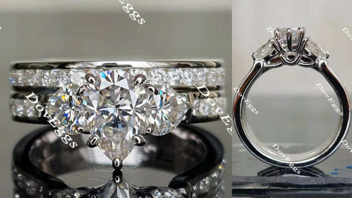 The center stone of picture is 2ct(6*9mm) GHI color Pear H&A Cut moissanite. Side stone: 2 pieces of 0.5ct(5mm) heart H&A moissanite. Ring setting is 10k white gold.