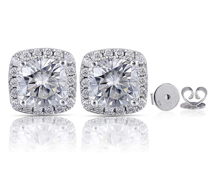 Center stone in picture is 1.1ct(6*6mm)/per G-H-I color cushion moissanite.Accents. ONLY earring post is 14k white gold. The rest part of earring is sterling silver.