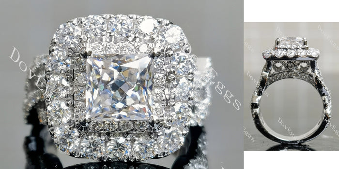 Center stone: 2ct(7mm), Princess Astro Cut, GHI color(near colorless) moissanite, VS1-VVS1 clarity