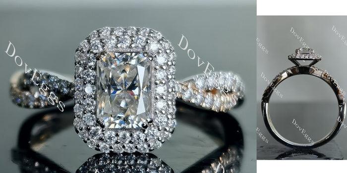 Center stone: 1ct(5*7mm), radiant Astro cut, GHI color (near colorless) moissanite, VS1-VVS1 clarity