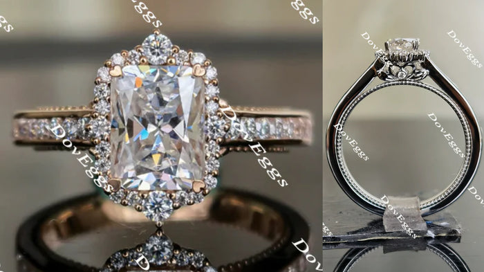 The center stone of picture is around 2ct(6*8mm) GH color astro cut radiant DovEggs moissanite. Ring setting is 10k rose gold/14k white gold.