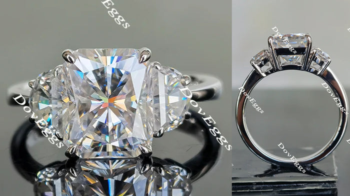 The center stone of picture is around 4ct(8*10mm) DEF color radiant H&A DovEggs moissanite. Accent stone is half moon cut moissainte.Ring setting is 18k white gold.