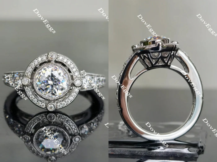 Center stone of picture is 1ct(6.5mm) GHI color Round Nova Cut DovEggs moissanite. Ring setting is 10k white gold.