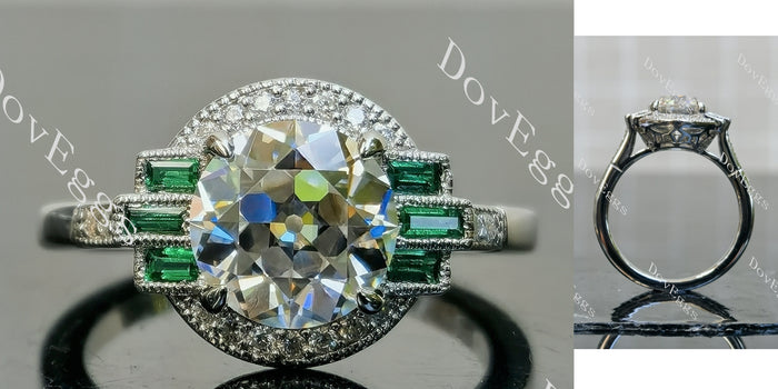Center stone: 2.5ct(8.5mm), Old Europe Cut, Round, GHI (near colorless) moissanite, VS1-VVS1 clarity