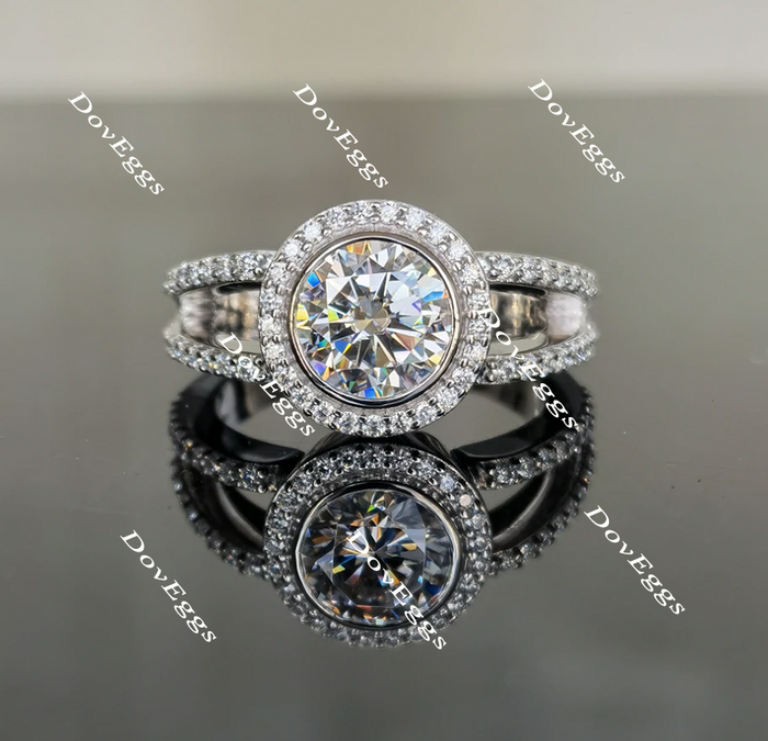 Center stone of picture is 1.5ct(7.5mm) GHI color round H&A DovEggs moissanite. Ring setting is 10k white gold.