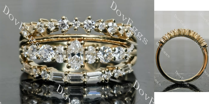 Stones: 3*5mm oval, 2*4mm oval, 1.5*3mm baguette, round, near colorless/colorless moissanite, VS1-VVS1 clarity