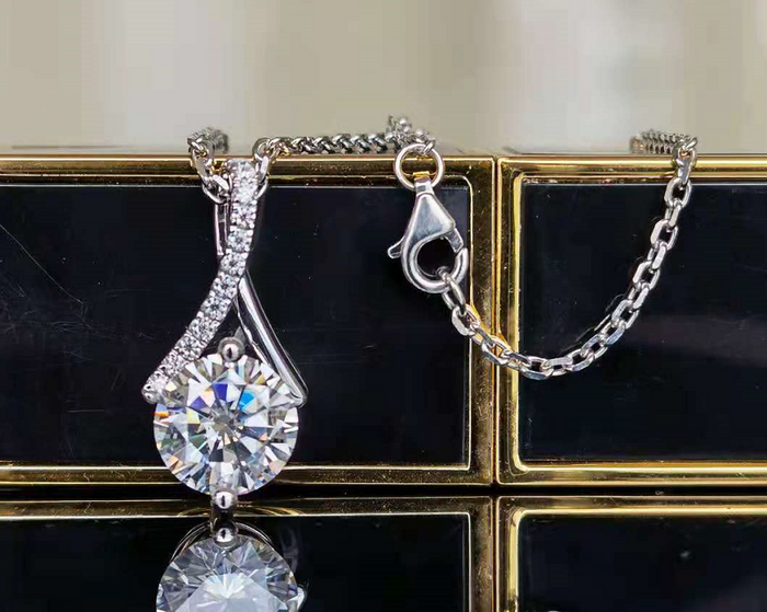 The center stone of picture is 1.5ct(7.5mm) DEF/GHI color moissanite, accents: moissanite. Necklace setting is 14k white gold.If you need a chain, the color of 14k and 18k chain will be the same as the pendant. We will ship a sterling silver chain to you if you order the 10K pendent only.