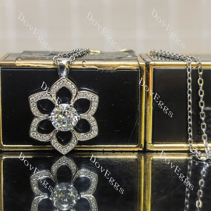 Center stone: 1ct(6.5mm) Round Astro cut, GHI (near colorless/colorless) moissanite, VS1-VVS1 clarity (Due to the pendant shape, the stone is fixed at 1ct)