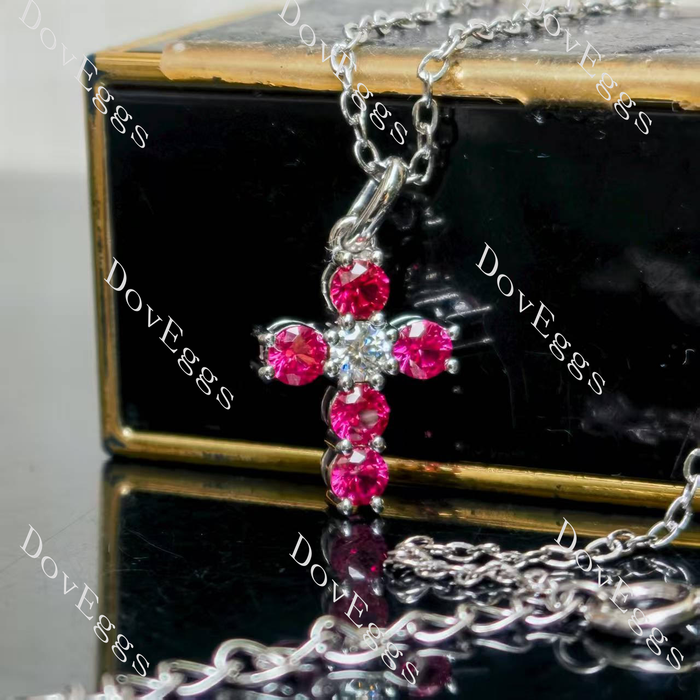 Center stone: 0.1ct(3mm) Round, Vivid pigeon blood ruby Sapphires & GHI (near colorless/colorless) moissanite, VS1-VVS1 clarity