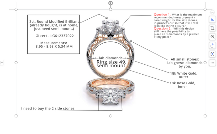$834 for this ring without 3ct round center and 2 pieces 3mm princess center stones, with no bigger than 2.5mm round lab grown diamond accents in 18K rose gold inner shank and 18K white gold inner outer shank. Size 4.75