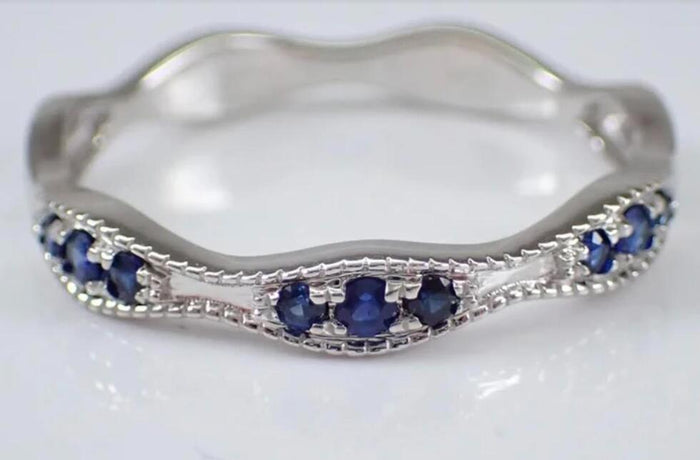 It is $390 for this wedding band with blue sapphire stones in 10K white gold. Size 7.