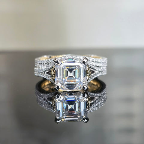 Standard Asscher uses the standard Step Cut as a default (rectangular or square) and has facets that graduate from the stone’s face like a set of steps. It shows greater and clearer brilliance due to larger facets compared to other cuts. It also shows the clarity & color of the stone more clearly.