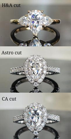 2. Astro Cut™ is a series which features the most diamond-like appearance, based on customer feedback. Astro cut™ is a cut we developed by DovEggs mean to resemble diamond more, it was mixed by the crushed ice cut and the old European cut. It shows less brilliance than H&A. For the elongated shape, the Crushed ice cut shows more in the Astro cut™ since it has 99 facets.
