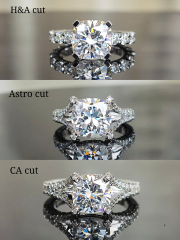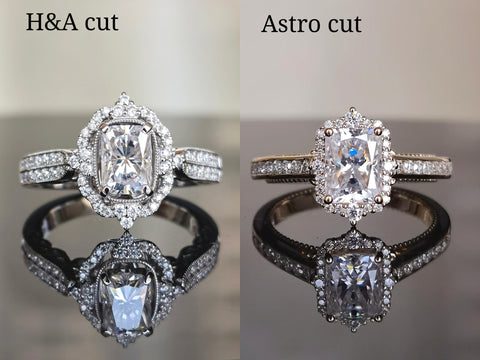 2. Astro Cut™ is a series which features the most diamond-like appearance, based on customer feedback. Astro cut™ is a cut we developed by DovEggs mean to resemble diamond more, it was mixed by the crushed ice cut and the old European cut. It shows less brilliance than H&A. For the cushion shape, the old European cut shows more in the Astro cut.