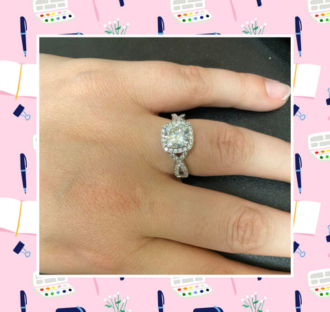 I fell hopelessly in love with the Doveggs cushion halo moissanite bridal set. I knew it was the one because I kept coming back to it for TWO years.