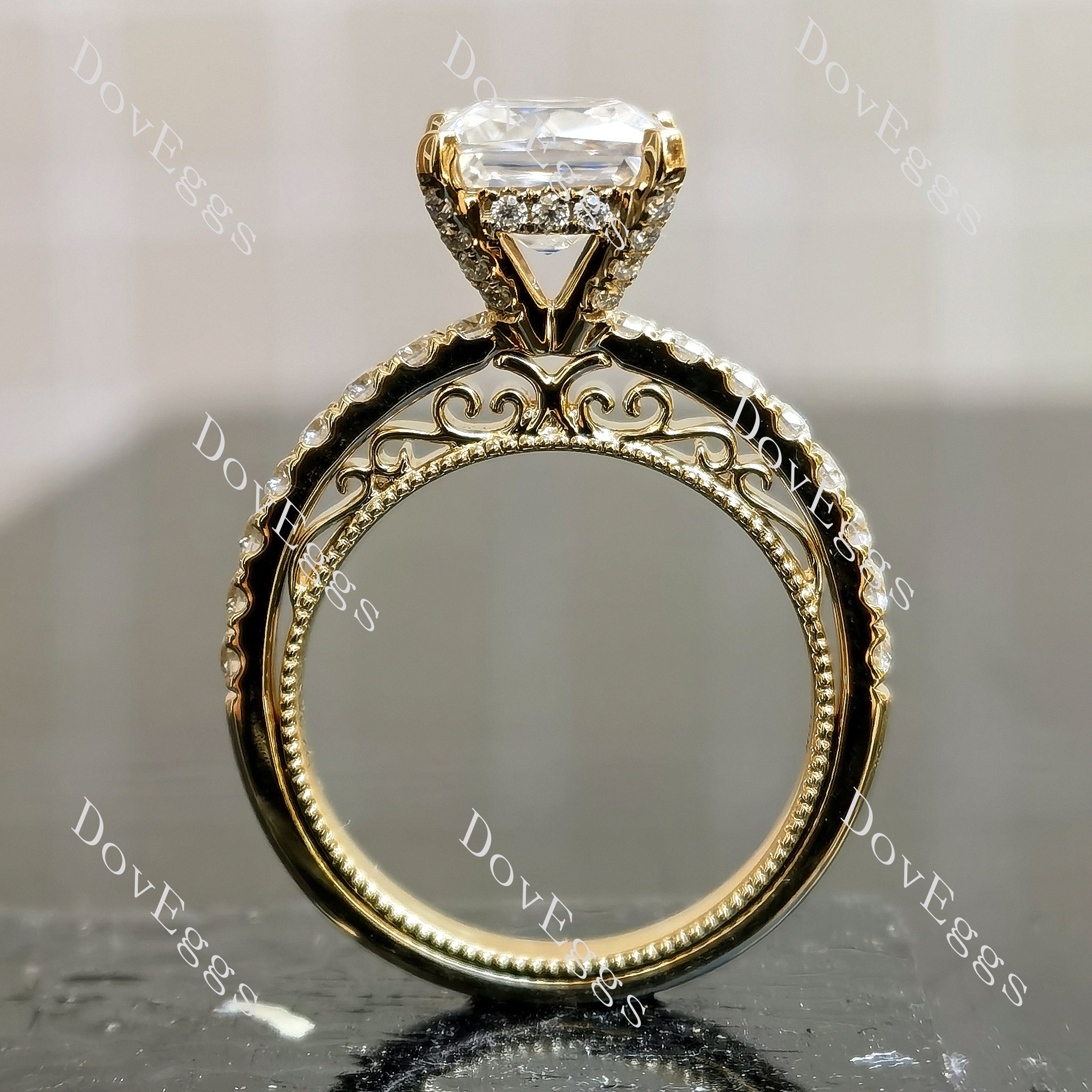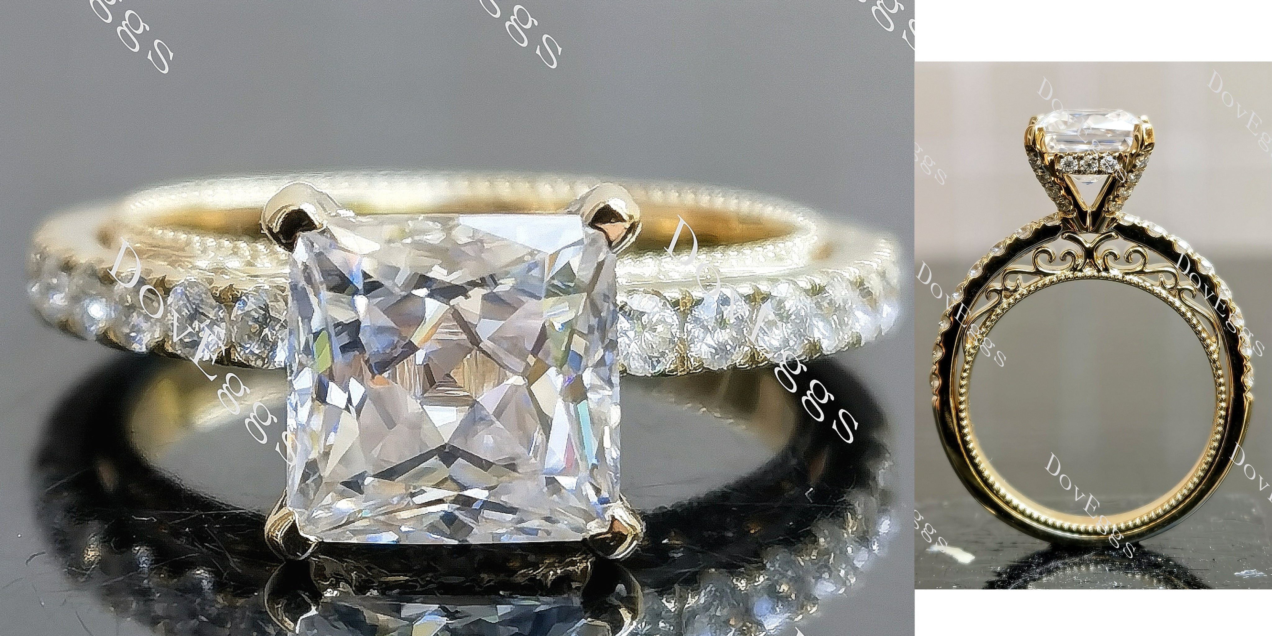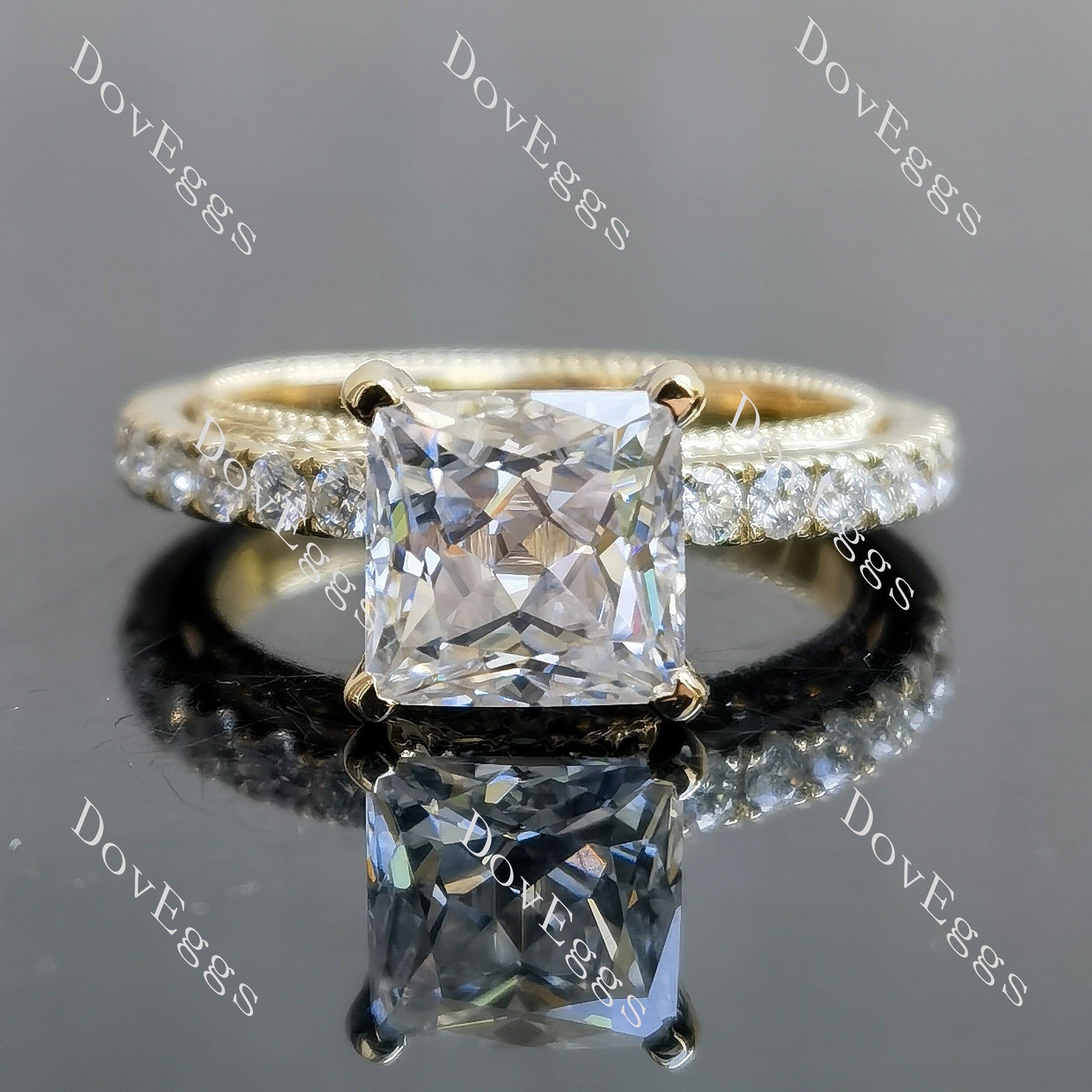 Center stone: 2ct(7mm) Princess Astro cut, DEF (colorless) moissanite, VS1-VVS1 clarity
