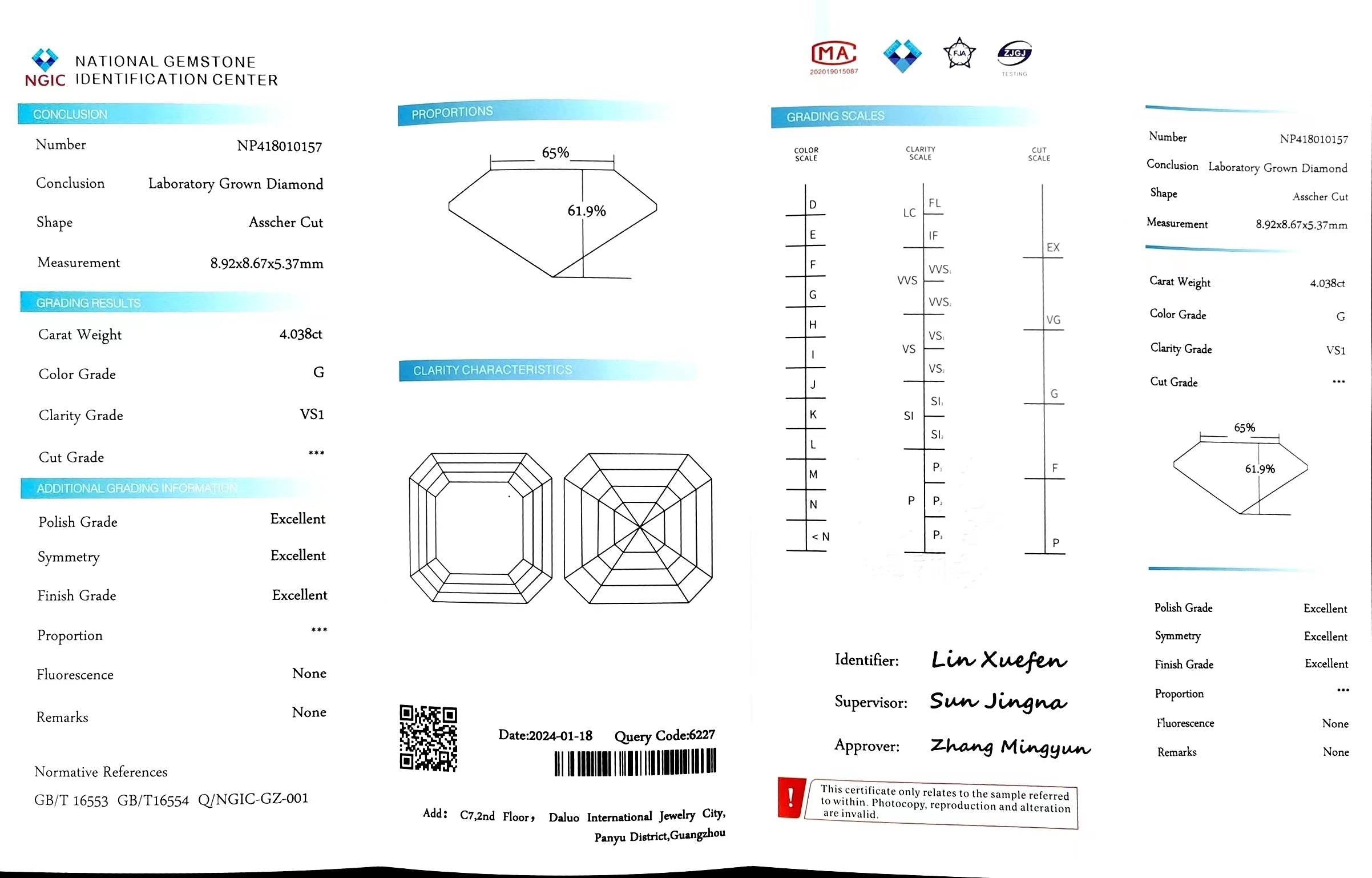 NGIC Certificate #: NP418010157(We will ship the lab-grown diamond to you along with the NGIC certificate. You can scan the barcode on the report to access the third party certificate.)