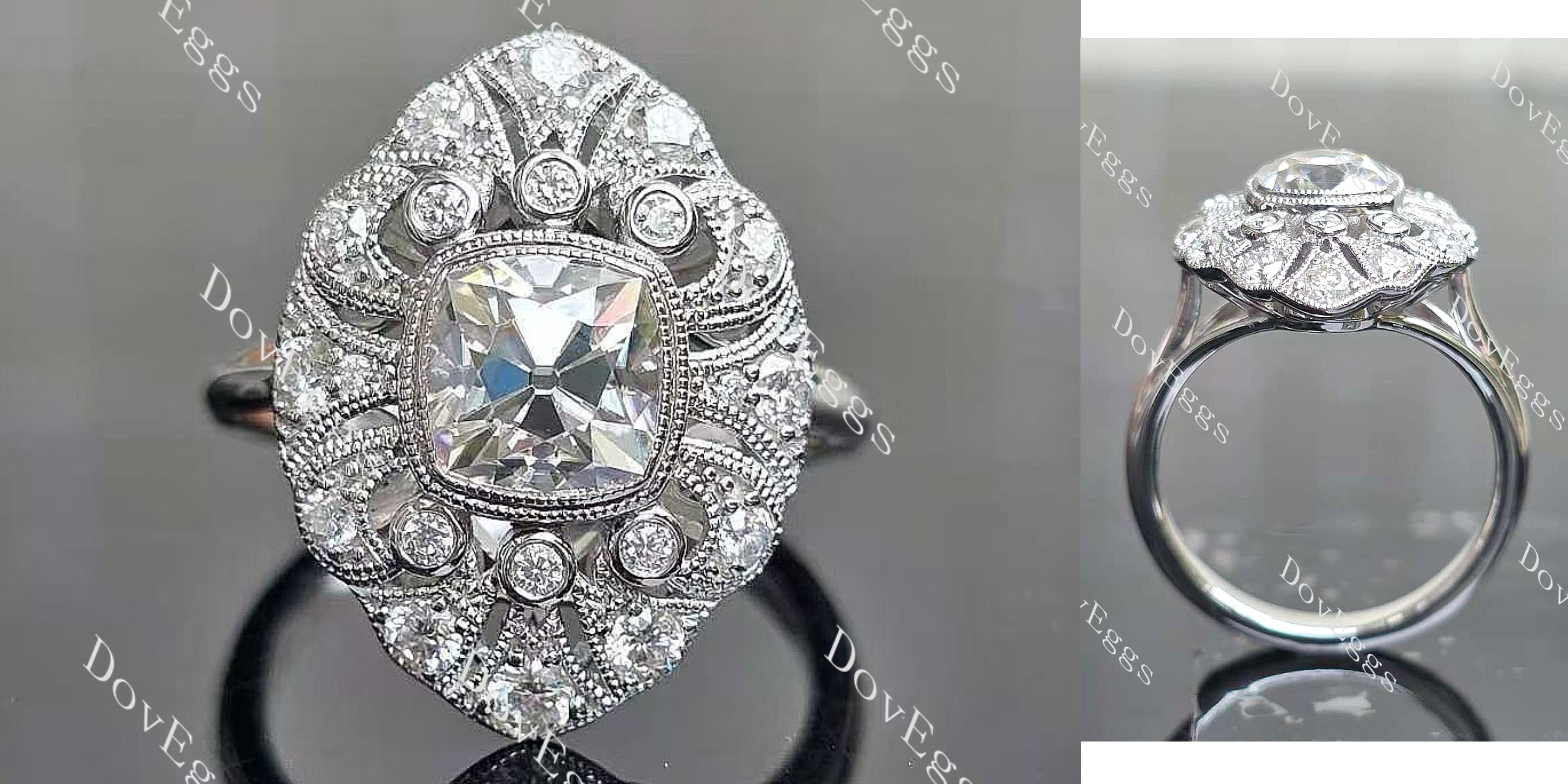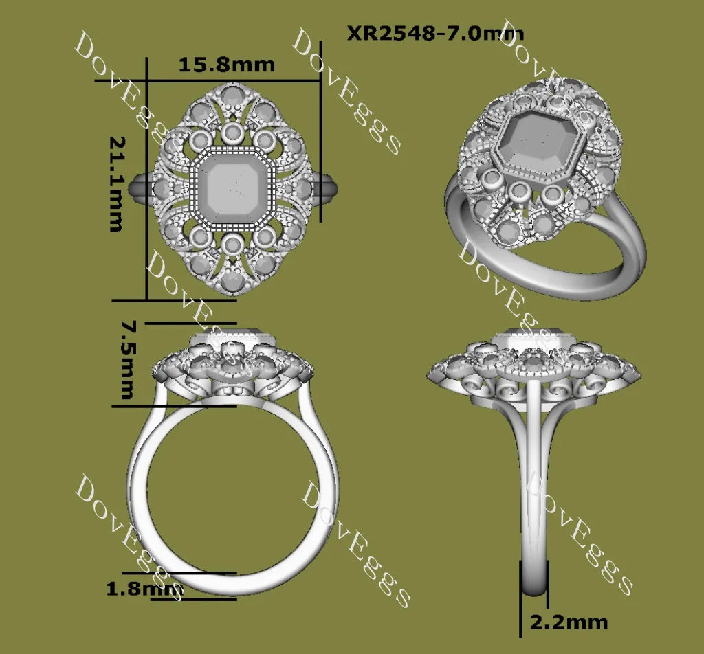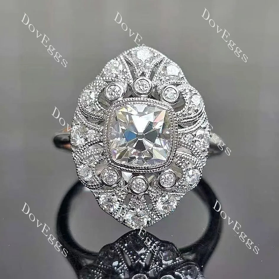Center Stone: 2ct(7.5mm) Square Cushion Old Mine Cut, Vivid pigeon blood ruby, colored gem VS1-VVS1 clarity (For overall harmony, the size and shape of the center stone remain fixed and unaltered.)