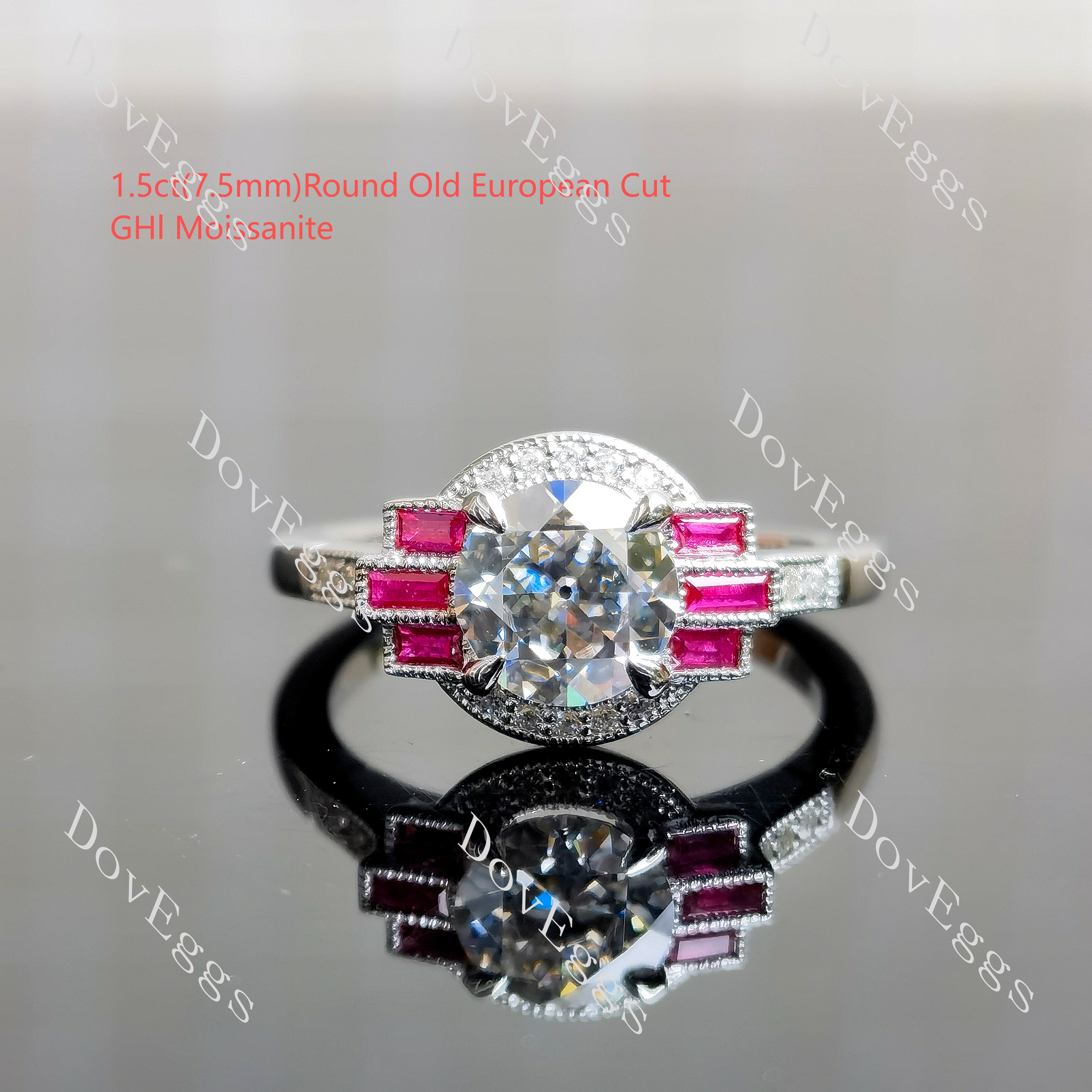 Center stone: 2.5ct(8.5mm), Old Europe Cut, Round, GHI (near colorless) moissanite, VS1-VVS1 clarity