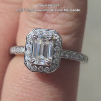 Center stone of picture is 3 carat(7*9mm) GHI color emerald cut DovEggs moissanite. Ring setting is 10k white gold.