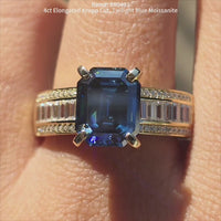 The center stone of picture is 5ct(9*11mm) GHI color radiant Astro cut DovEggs moissanite. The accent stone is emerald and round moissanite. Ring setting is 14k yellow gold.