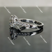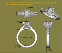 Center stone of picture is 2ct(6*9mm) GHI color elongated oval nova cut DovEggs moissanite. Ring setting is 14k white gold.