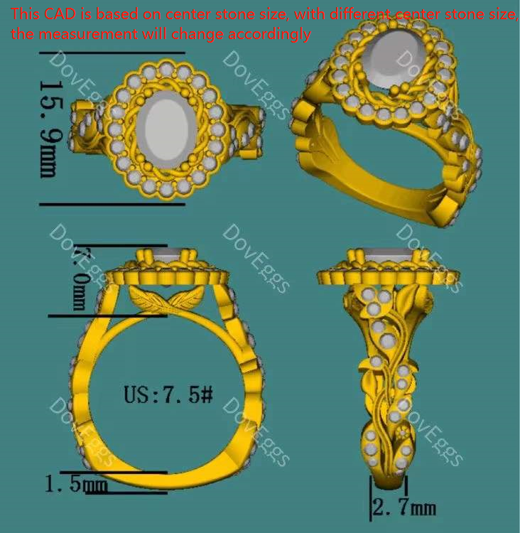 The center stone of picture is 2ct(7*9mm) astro oval cut DovEggs moissanite. Ring setting is 14k yellow gold.
