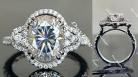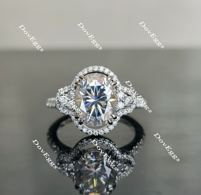The center stone of picture is 3ct(8*10mm) oval H&A cut DovEggs moissanite. Ring setting is 14k white gold.