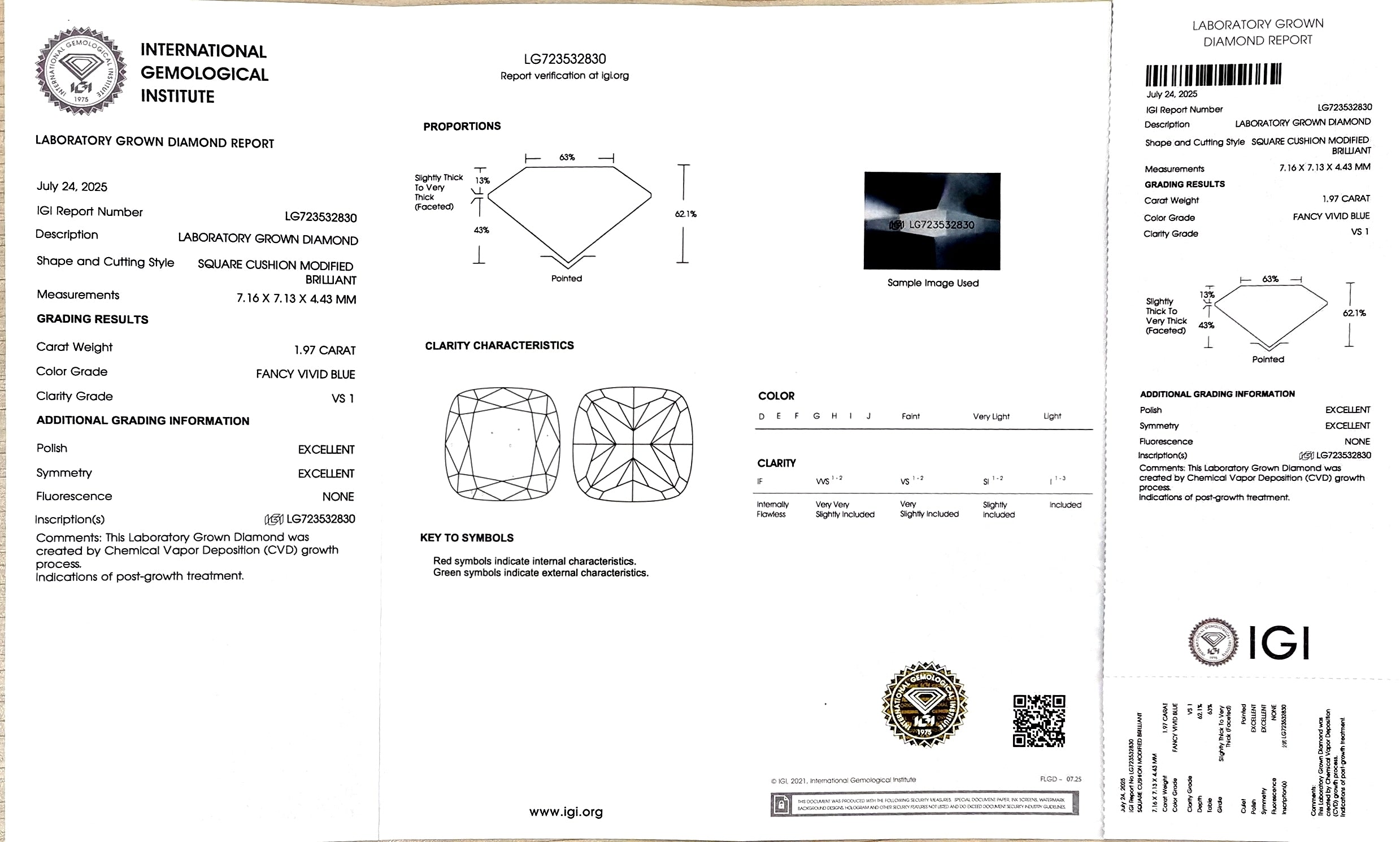 IGI Certificate #: LG723532830(We will ship the lab-grown diamond to you along with the IGI ertificate. You can scan the barcode on the report to access the third party certificate.)