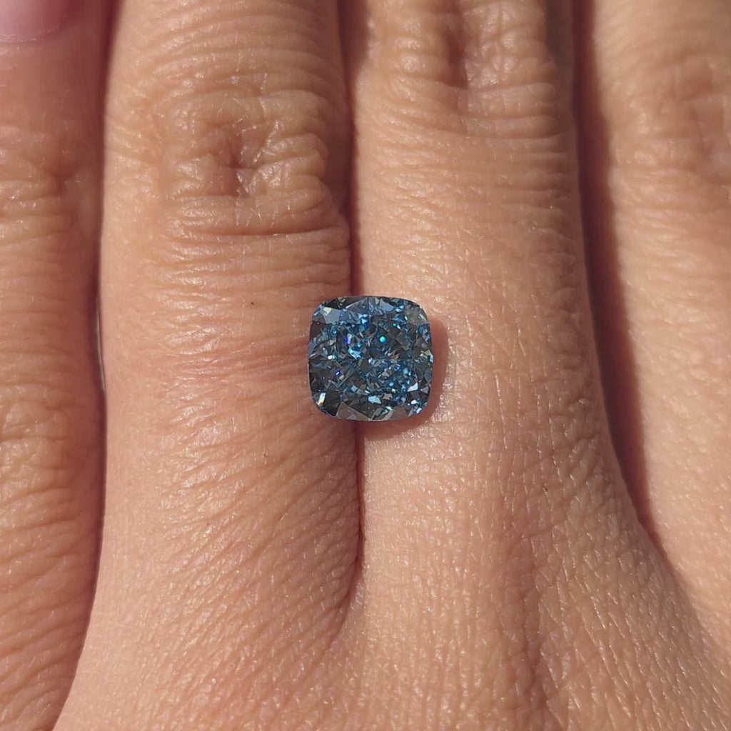 Center stone: 1.97ct(7.16X7.13X4.43 MM), Square Cushion, Fancy Vivid Blue color, VS1 Clarity, Excellent cut