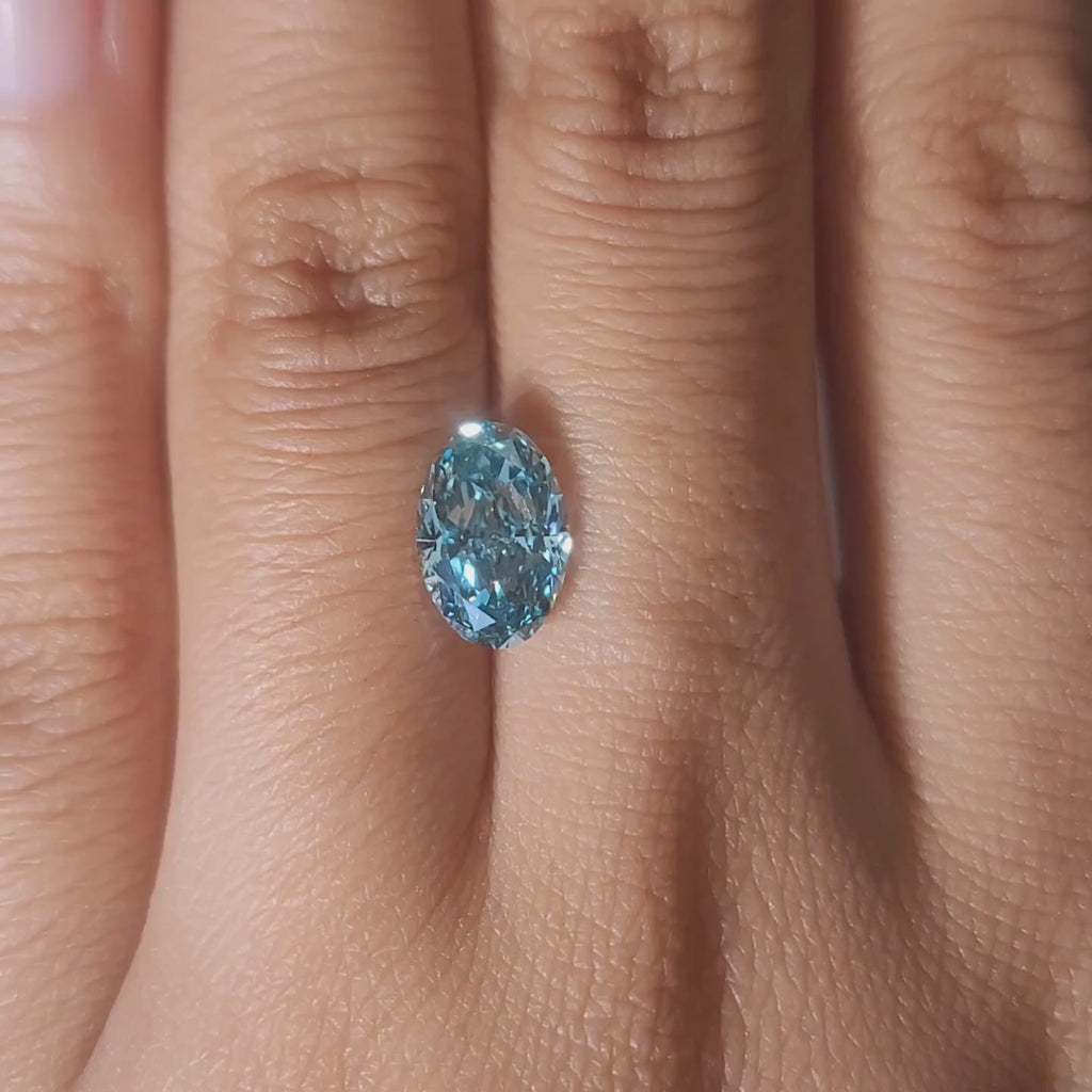 Center stone: 2.27ct(10.11x6.79x4.31mm), Oval Brilliant Cut, Fancy Vivid Greenish Blue color, VS1 Clarity, Excellent cut