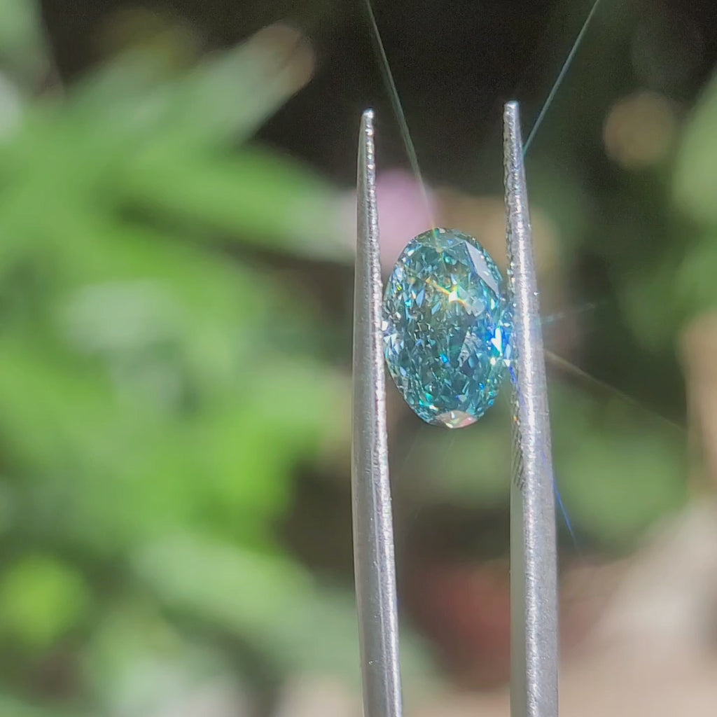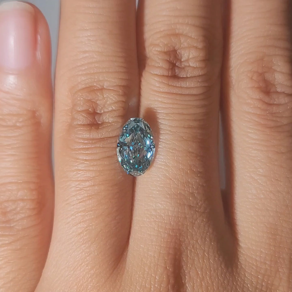 Center stone: 2.28ct(10.32x6.74x4.19mm), Oval Brilliant Cut, Fancy Vivid Bluish color, VVS2 Clarity, Excellent cut