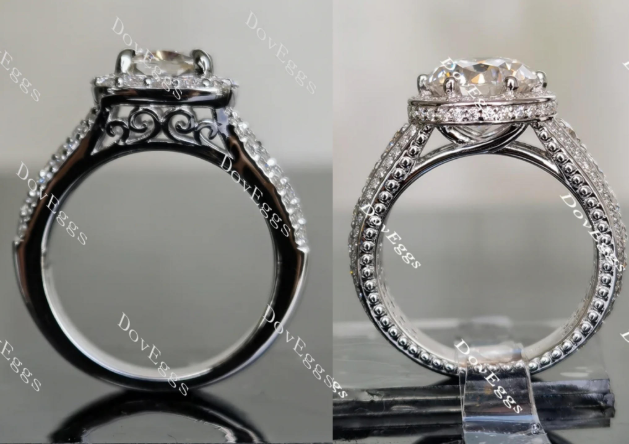 We need change the sides to be like the ring on the right  I’d like the dots along sides, the channel set moissy around the side of the halo and the crossing gallery.