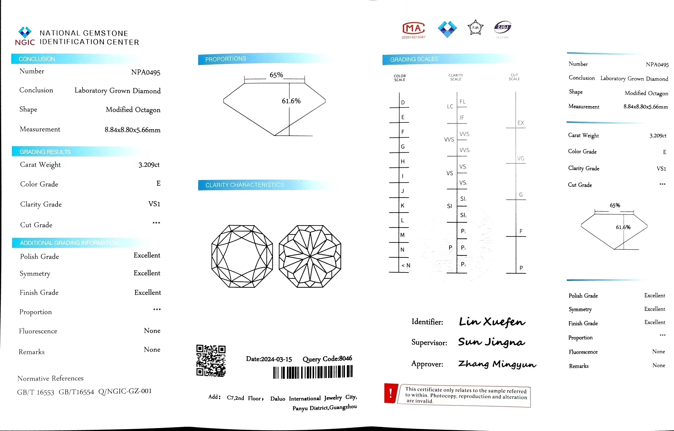 NGIC Certificate #: NPA0495(We will ship the lab-grown diamond to you along with the NGIC certificate. You can scan the barcode on the report to access the third party certificate.)