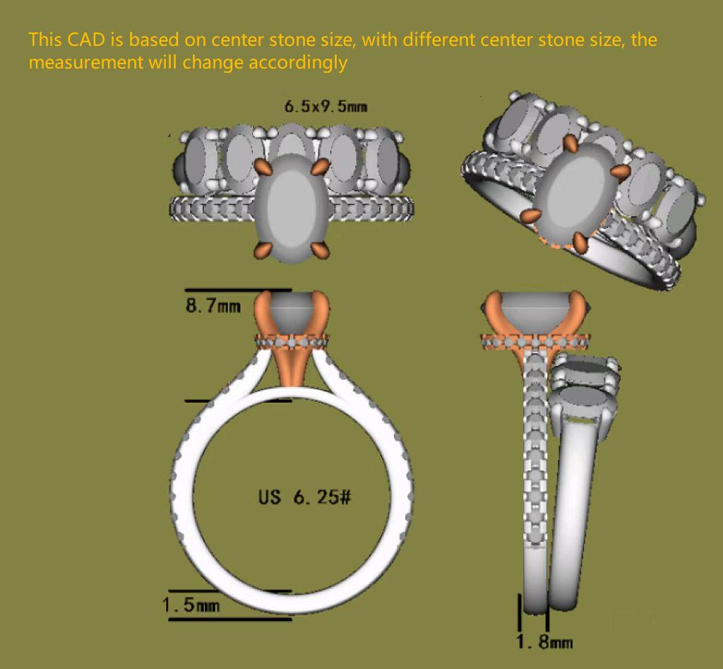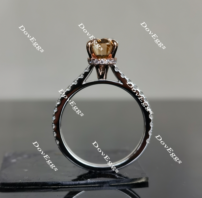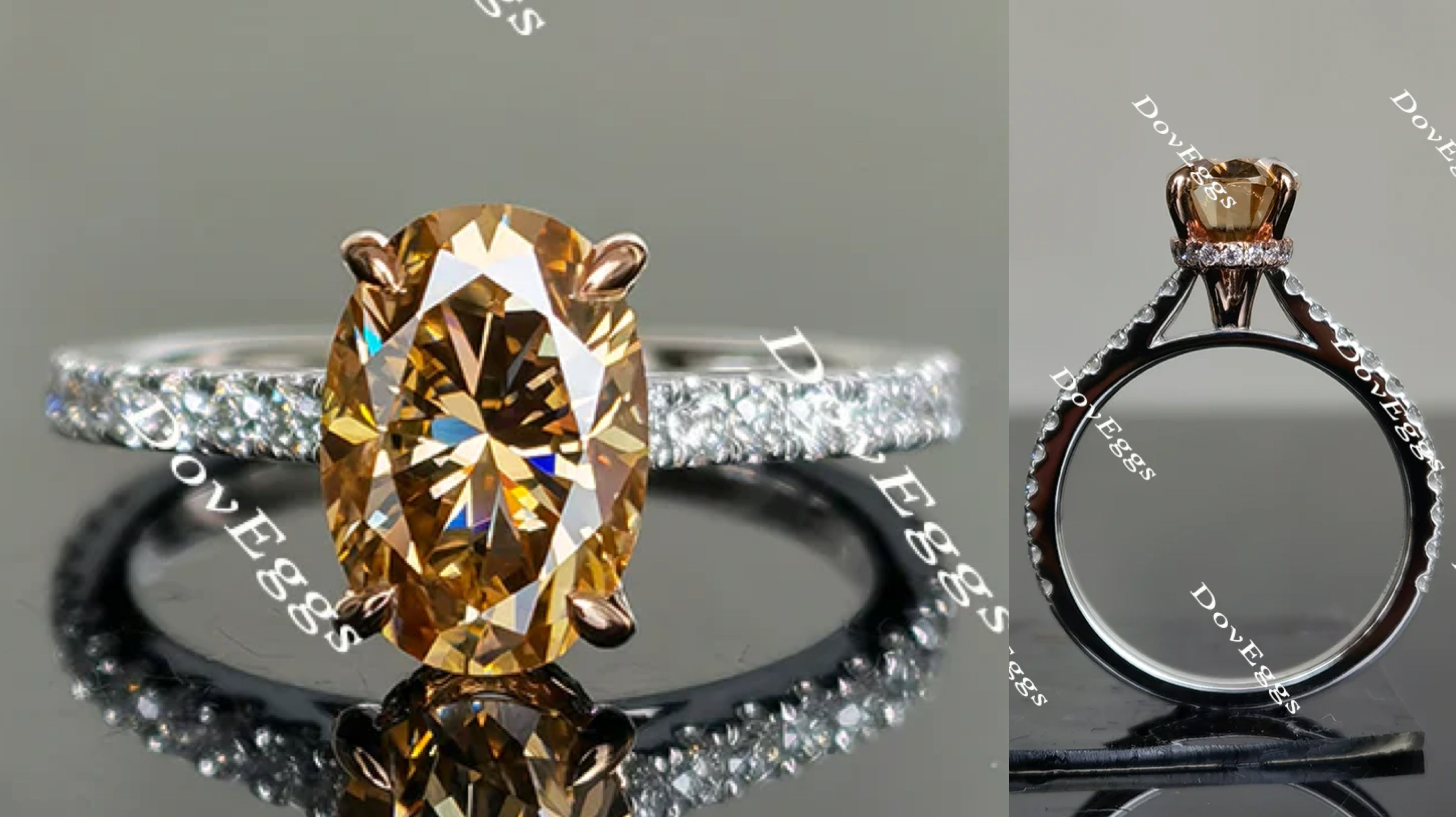 The center stone of picture is 2.5ct(6.5*9.5mm) elongated oval cut champagne moissanite. Ring setting is 10k white gold(outer band) and rose gold.