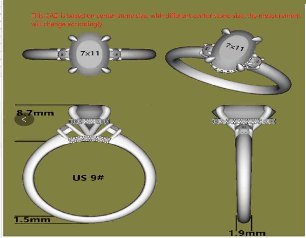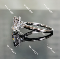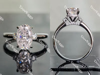 Center stone of picture is 3ct(7*11mm) DEF color elongated oval Astro cut DovEggs moissanite. Ring setting is 10k white gold.