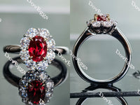 The center stone of picture is 1ct(5*7mm) oval shape vivid pigeon blood ruby colored gem. Accents: Doveggs moissanite. Ring setting is 10k white gold and yellow gold(prongs).