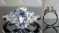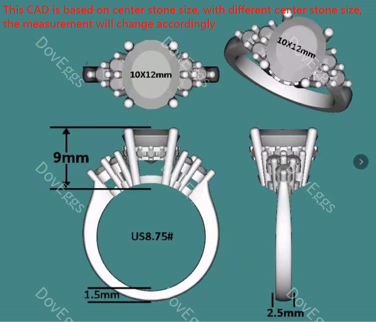 The center stone of picture is 4ct(8*11mm) oval H&A moissanite DovEggs moissanite. Ring setting is 10k white gold.