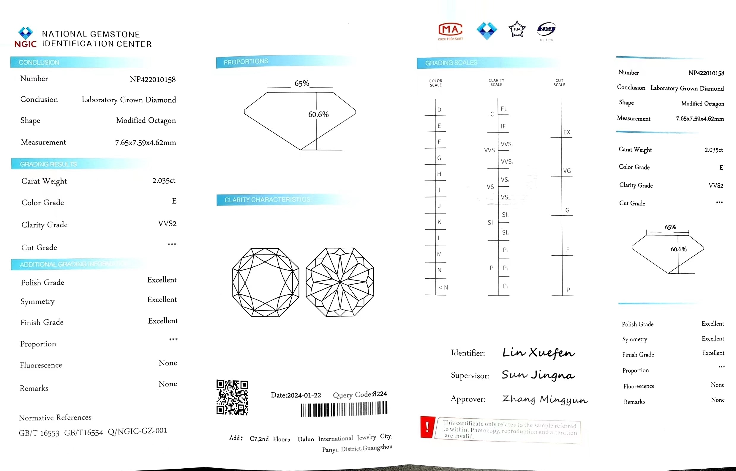 NGIC Certificate #: NP422010158(We will ship the lab-grown diamond to you along with the NGIC certificate. You can scan the barcode on the report to access the third party certificate.)