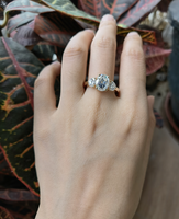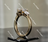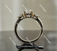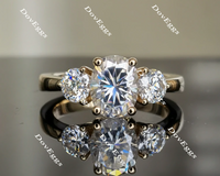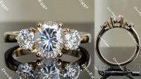 Center stone of picture is round H&A 0.5ct(5mm)--oval H&A 2ct(7*9mm)--round H&A 0.5ct(5mm) DovEggs moissanite. Ring setting is 10k yellow gold.