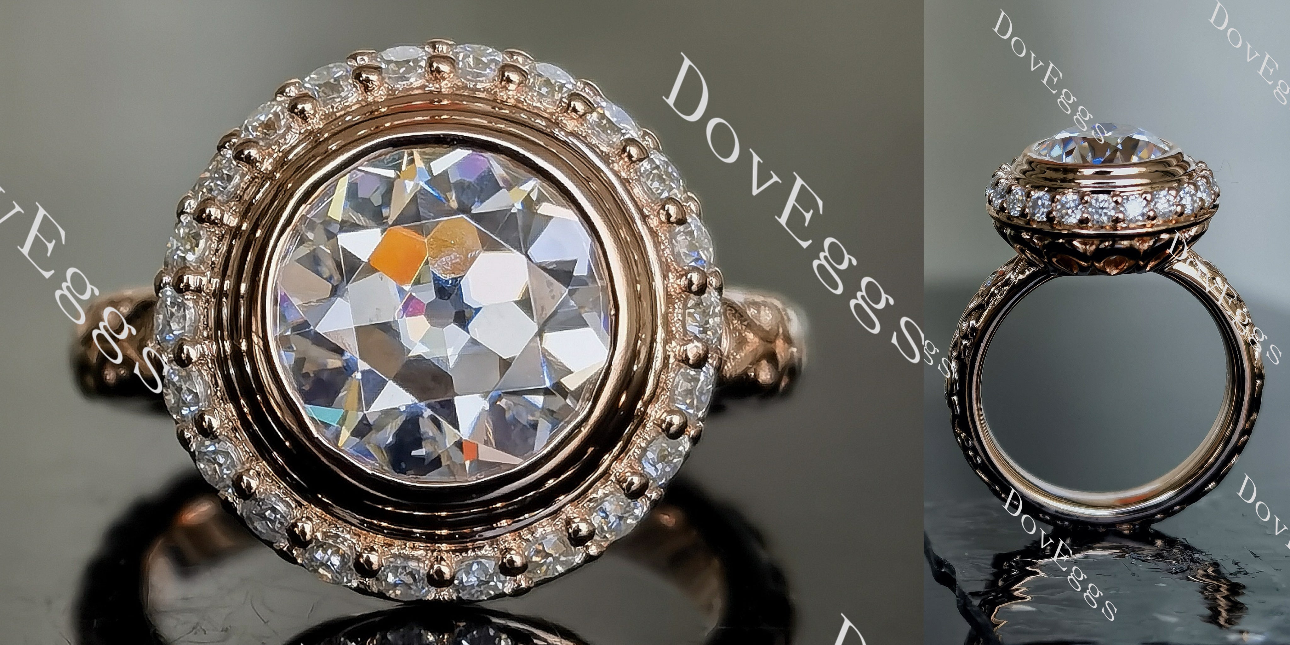 Center stone of picture is 2.5ct(8.5mm)GHI color round old europe Cut DovEggs moissanite. Ring setting is 14k rose gold/14k white gold.