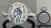 The center stone of picture is 3ct(8*10mm) DEF color oval H&A cut moissanite. Ring setting is 14k white gold.