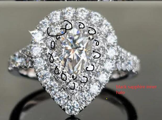 XR0953 ring semi mount without 5ct pear center, with moissanite accents and black sapphire inner halo stone in SS. Size 8